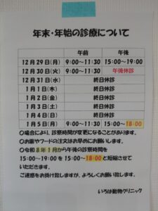 また、早くからお休みになる業者さんもありますので、継続のお薬やフードなど、お早めの注文をお願い致します。